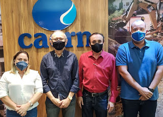 Souza ao lado da Prefeita eleita de Grossos, Cintia Sonaly, estive com a direção da CAERN: Roberto Sérgio (Diretor Presidente) e Thiago Índio (Diretor técnico).